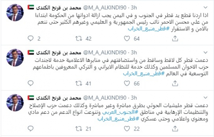 وكان ناشطون أطلقوا هاشتاج "قطر منبع الخراب"، وذلك للكشف عن الدور الخبيث الذي تقوم به دولة قطر في دعم العصابات والفوضى بالجنوب وتخريب الوطن العربي لأجل خدمة العدو.