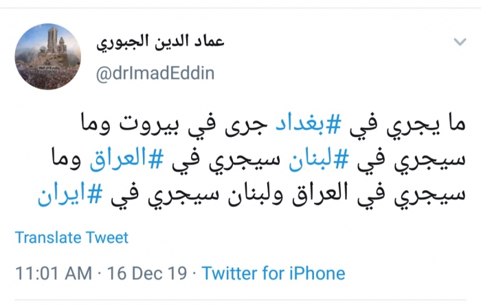 وكتب الجبوري، في تغريدة له على موقع التواصل الاجتماعي تويتر، تابعها المشهد العربي: "ما يجري في بغداد جرى في بيروت وما سيجري في لبنان سيجري في العراق".