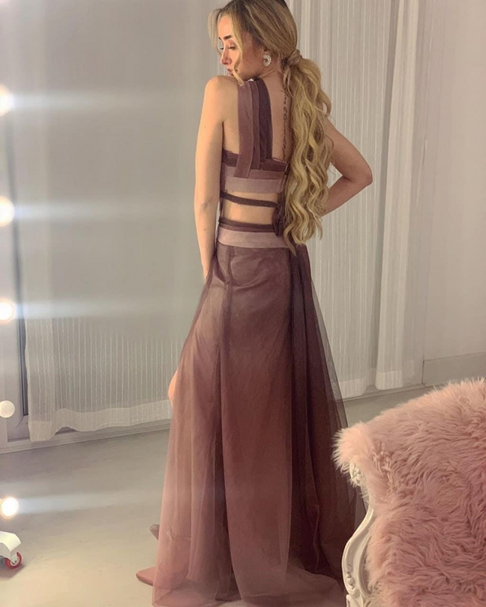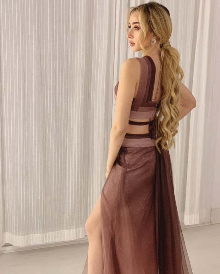 وظهرت هنا في الصور بفستان موف طويل، مفتوح من الأجناب والقدم.