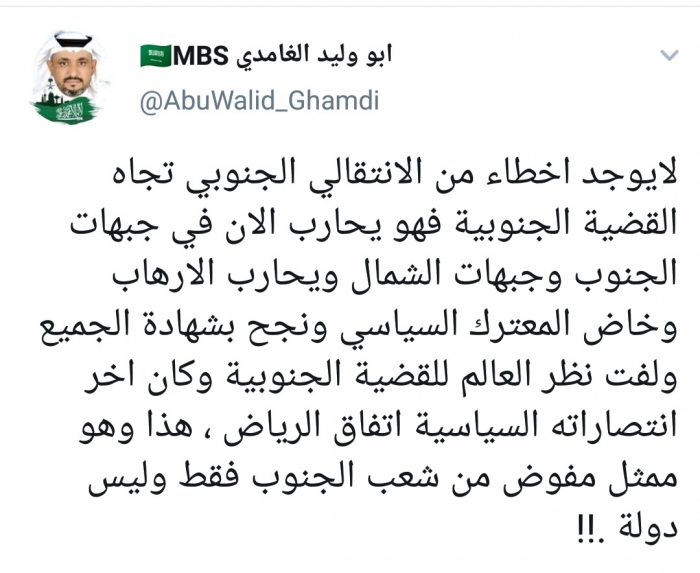 وكتب الغامدي، في تغريدة له على موقع التواصل الاجتماعي تويتر، تابعها المشهد العربي: "المجلس الانتقالي يحارب الآن في جبهات الجنوب وجبهات الشمال ويحارب الإرهاب وخاض المعترك السياسي ونجح بشهادة الجميع ولفت نظر العالم للقضية الجنوبية وكان اخر انتصاراته السياسية اتفاق الرياض".
