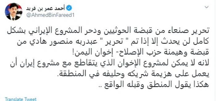 وكتب في تغريدة عبر "تويتر" رصدها "المشهد العربي": "تحرير صنعاء من قبضة الحوثيين ودحر المشروع الإيراني بشكل كامل لن يحدث إلا إذا تم تحرير عبدربه منصور هادي من قبضة وهيمنة حزب الإصلاح- إخوان اليمن-!".