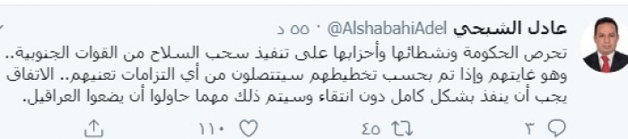 وكتب الشبحي عبر "تويتر":" تحرص حكومة الشرعية ونشطائها وأحزابها على تنفيذ سحب السلاح من القوات الجنوبية،وهو غايتهم وإذا تم بحسب تخطيطهم سيتنصلون من أي التزامات تعنيهم".
