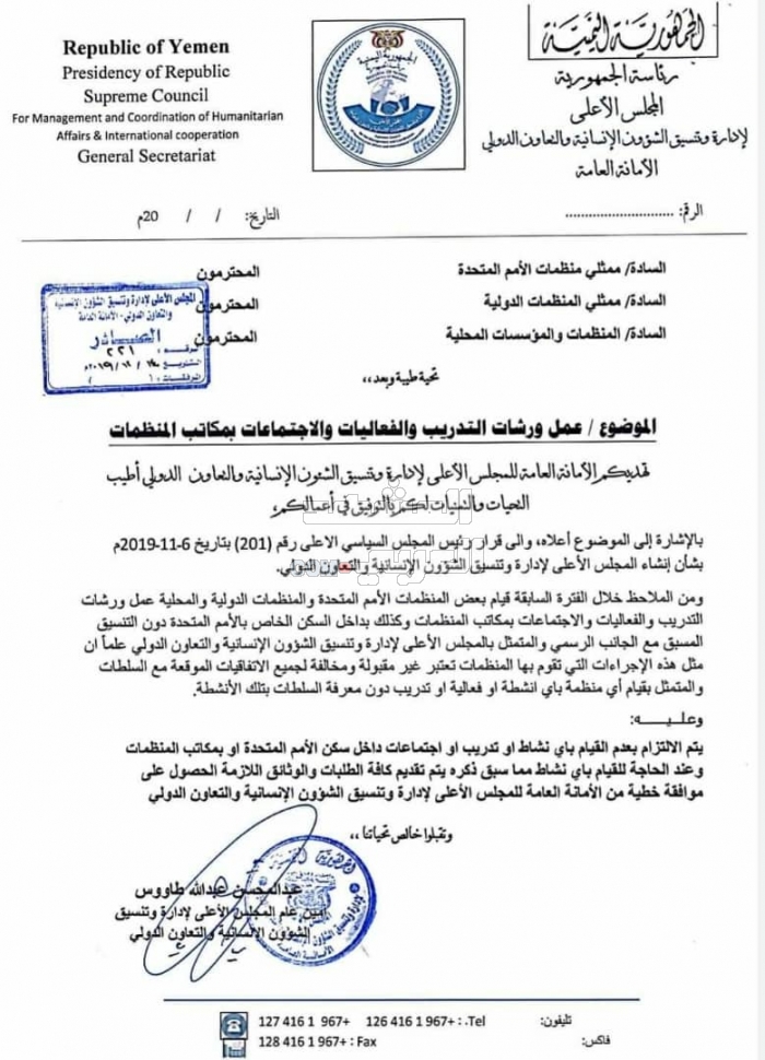 وأصدر ما يسمى المجلس الأعلى لإدارة وتنسيق الشئون الإنسانية، الذي أنشأته المليشيا للتحكم بعمل المنظمات الدولية، تعميما جديدا حصل "المشهد العربي" على صورة منه، طالب المنظمات بعدم عقد أي اجتماعات في مقارها إلا بعد الحصول على إذن مسبق.