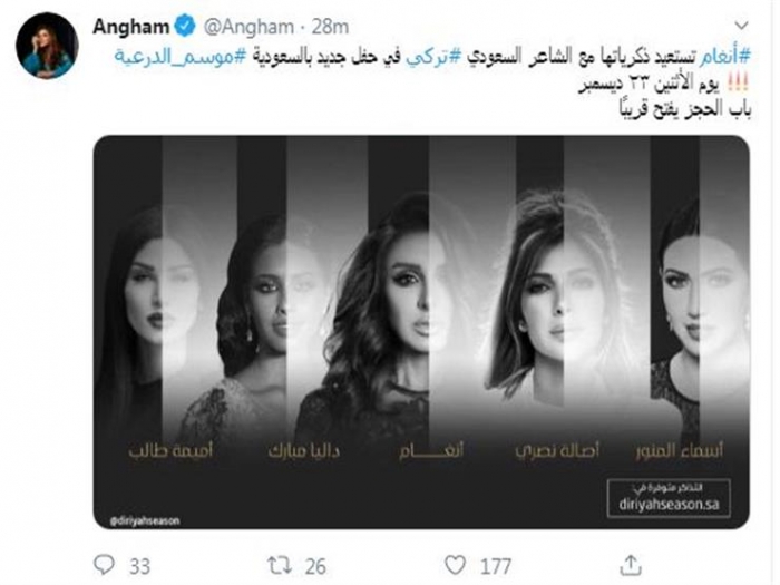 ونشرت أنغام، بوستر الحفل، عبر حسابها على"تويتر"، قائلة: "أنغام تستعيد ذكرياتها مع الشاعر السعودي تركي في حفل جديد بالسعودية، موسم الدرعية يوم الاثنين ٢٣ ديسمبر".