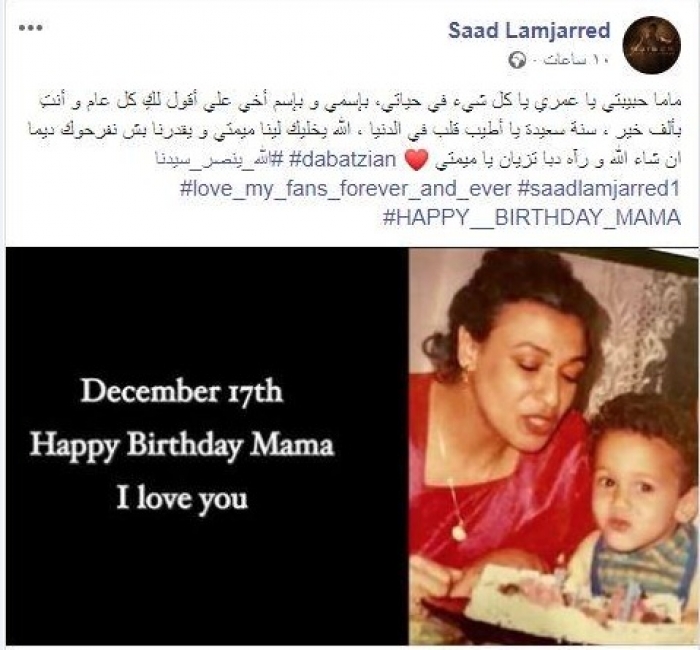 احتفل الفنان المغربي سعد لمجرد، بعيد ميلاد والدته، من خلال نشر صورة تجمعهما من طفولته، عبر حسابه بموقع "فيس بوك".
