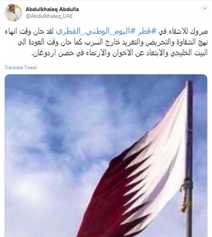 وقال في تغريدة عبر "تويتر" رصدها "المشهد العربي": "مبروك للأشقاء في قطر اليوم الوطني القطري لقد حان وقت إنهاء نهج الشقاوة والتحريض والتغريد خارج السرب كما حان وقت العودة إلى البيت الخليجي والابتعاد عن الإخوان والارتماء في حضن أردوغان".