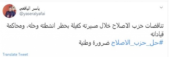 وكتب في تغريدة عبر "تويتر" رصدها "المشهد العربي": "تناقضات حزب الإصلاح خلال مسيرته كفيلة بحظر أنشطته وحله، ومحاكمة قياداته.. حل حزب الإصلاح ضرورة وطنية".
