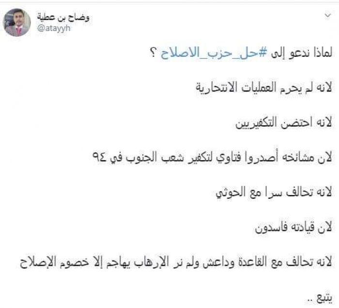 كشف الكاتب الصحفي وضاح بن عطية، اليوم، أسباب الدعوة إلى حل حزب الإصلاح.