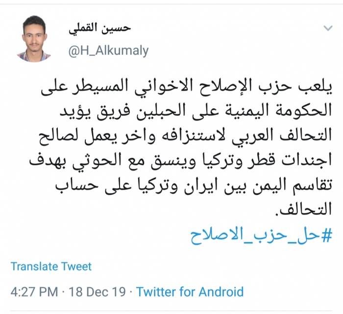 كشف الناشط السياسي، حسين القملي، ألاعيب حزب الإصلاح الإخوانية ضد التحالف العربي، لصالح أجندات قطر.