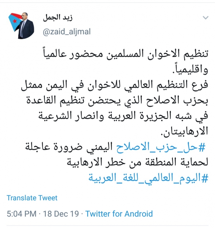 أكد عضو هيئة رئاسة المجلس الانتقالي الجنوبي، زيد الجمل، أن حل حزب الإصلاح الإخواني ضرورة عاجلة لحماية المنطقة العربية.