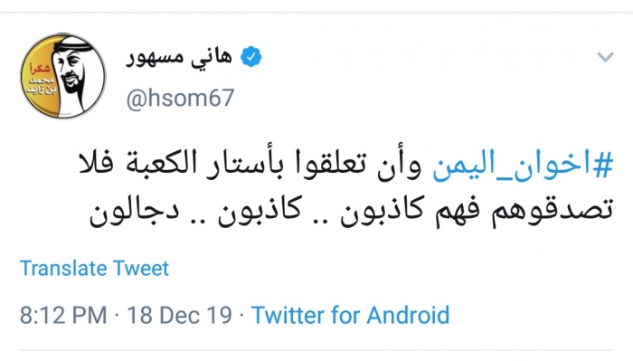 وكتب مسهور، في تغريدة له على موقع التواصل الاجتماعي تويتر، تابعها المشهد العربي: "إخوان اليمن وإن تعلقوا بأستار الكعبة فلا تصدقوهم فهم كاذبون .. كاذبون .. دجالون".