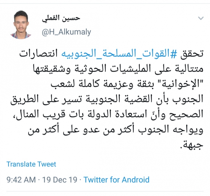 وكتب القملي، في تغريدة له على موقع التواصل الاجتماعي تويتر، تابعها المشهد العربي: "تحقق القوات المسلحة الجنوبية انتصارات متتالية على المليشيات الحوثية وشقيقتها الإخوانية بثقة وعزيمة كاملة لشعب الجنوب بأن القضية الجنوبية تسير على الطريق الصحيح".