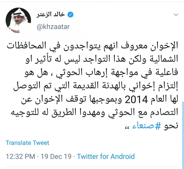 وكتب الزعتر، في تغريدة له على موقع التواصل الاجتماعي تويتر، تابعها المشهد العربي: "الإخوان معروف أنهم يتواجدون في المحافظات الشمالية ولكن هذا التواجد ليس له تأثير أو فاعلية في مواجهة إرهاب الحوثي".