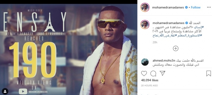 علق رمضان على البوستر: "الحمد لله أغنية (إنساي) ١٩٠مليون مشاهدة في ٥ أشهر، الأكثر مشاهدة واستماع عربيًا في ٢٠١٩، الأسطورة والمعلم، ثقة في الله نجاح".