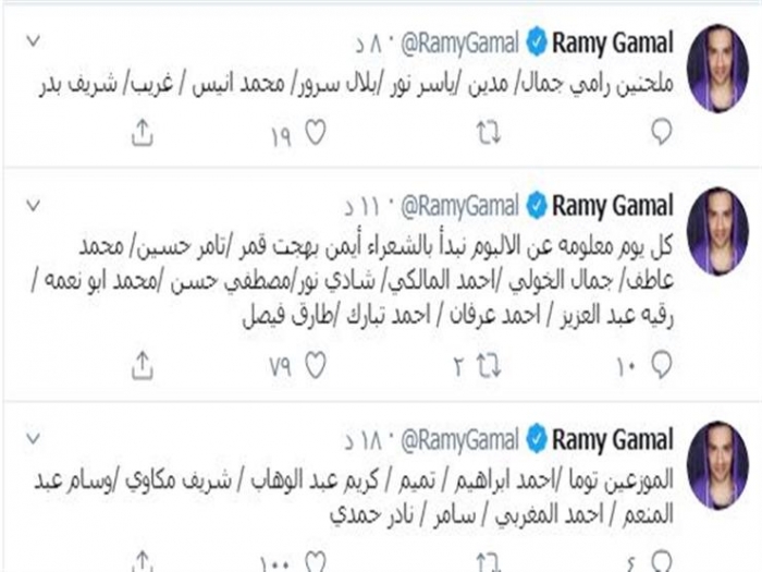 نشر رامي جمال، عبر حسابه الشخصي على "تويتر"، تغريدات أعلن بها عن معلومات حول ألبومه الجديد.