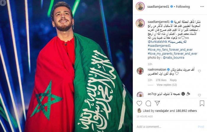 ونشر لمجرد، صورة له وهو يحمل علم بلده المغرب وعلم السعودية، عبر حسابه على "إنستجرام"، وعلق: "شكرًا لأهل المملكة العربية السعودية الطيبين على هذا الاستقبال الأكثر من رائع.. استمتعت كثيرًا وأنا أغني على مسرح (فنان العرب) الأستاذ محمد عبده، أعدكم إن شاء الله أن أرجع لإحياء حفلات عديدة بإذن الله".