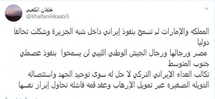 وكتب في تغريدة عبر "تويتر" رصدها "المشهد العربي": "المملكه والإمارات لم تسمح بنفوذ إيراني داخل شبه الجزيرة وشكلت تحالفًا دوليًا مصر ورجالها ورجال الجيش الوطني الليبي لن يسمحوا بنفوذ عصملي جنوب المتوسط تكالب العداء الإيراني التركي لا حل له سوى توحيد الجهد واستئصاله الدويلة الصغيرة عبر تمويل الإرهاب وعقد قمه فاشله تحاول إبراز نفسها".
