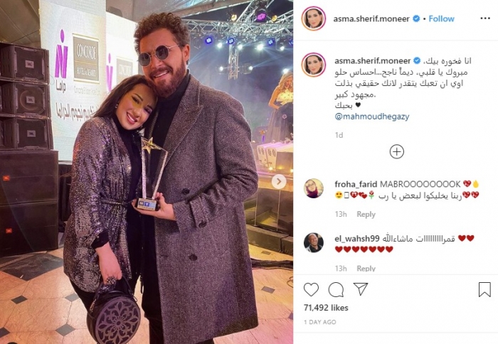 وكتبت أسما في تعليقها على الصورتين "أنا فخورة بيك، مبروك يا قلبي، دايماً ناجح.. احساس حلو اوي ان تعبك يتقدر لأنك حقيقي بذلت مجهود كبير.. بحبك".