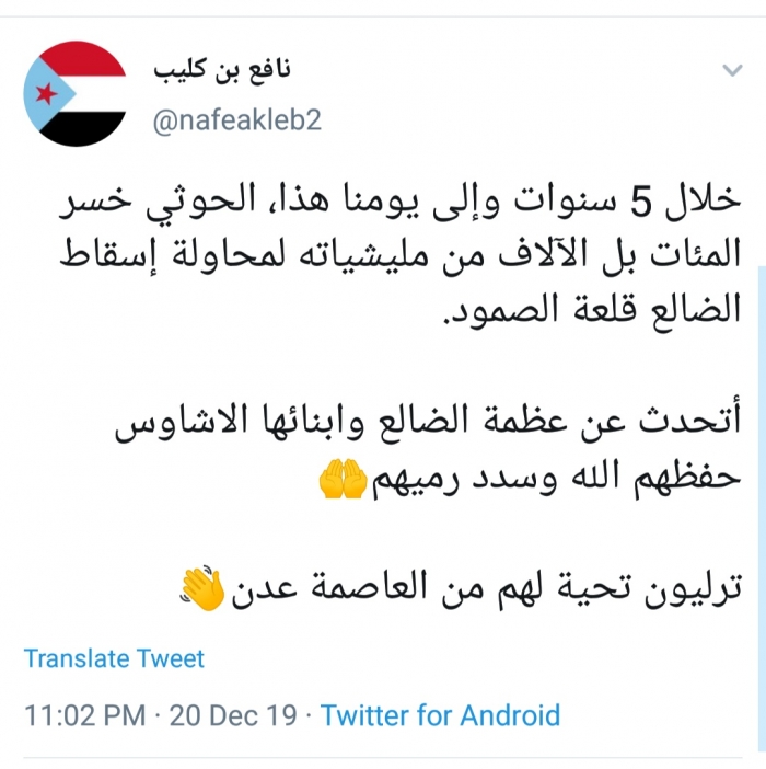 وكتب بن كليب، في تغريدة له عبر موقع التواصل الاجتماعي تويتر، تابعها المشهد العربي: "خلال 5 سنوات وإلى يومنا هذا، الحوثي خسر المئات بل الآلاف من مليشياته لمحاولة إسقاط الضالع قلعة الصمود".