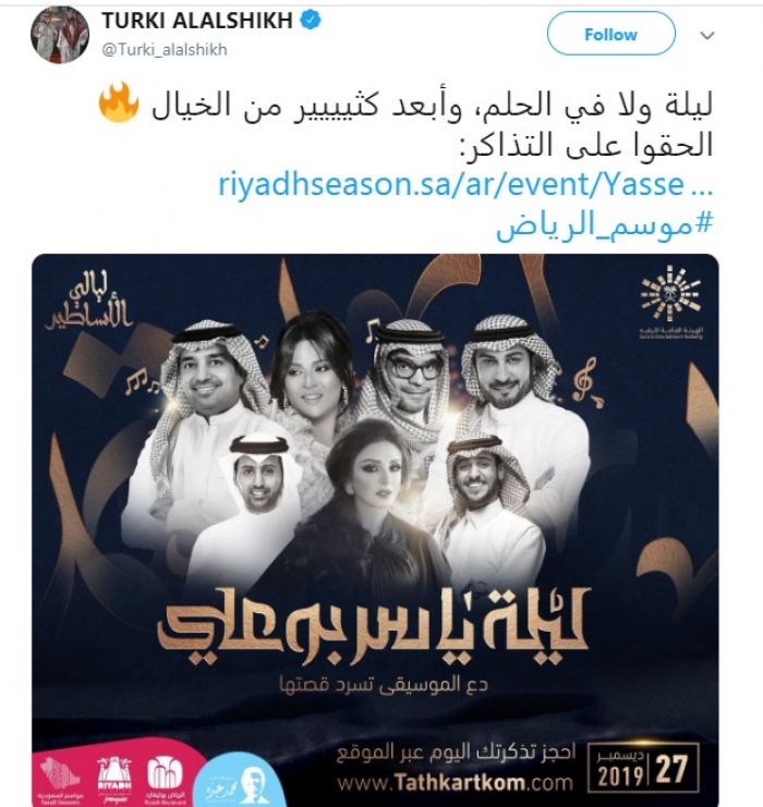 ونشر آل شيخ بوستر دعائيًا للحفل، عبر حسابه الرسمي بموقع "تويتر"، وعلق :"ليلة ولا في الحلم، وأبعد كثير من الخيال".