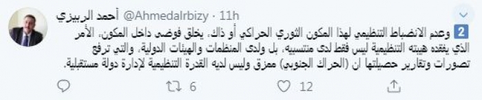 وأضاف: "وعدم الانضباط التنظيمي لهذا المكون الثوري الحراكي أو ذاك، يخلق فوضى داخل المكون، الأمر الذي يفقده هيبته التنظيمية ليس فقط لدى منتسبيه، بل ولدى المنظمات والهيئات الدولية، والتي ترفع تصورات وتقارير حصيلتها أن (الحراك الجنوبي) ممزق وليس لديه القدرة التنظيمية لإدارة دولة مستقبلية".