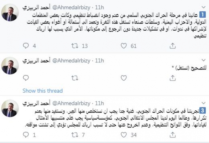 وكتب في تغريدات عبر "تويتر" رصدها "المشهد العربي": "عانينا في مرحلة الحراك الجنوبي السلمي من عدم وجود انضباط تنظيمي وكانت بعض المنظمات الدولية، والأحزاب اليمنية، وسلطات صنعاء تستغل هذه الثغرة وتعمد إلى استمالة أو أغواء بعض القيادت لإشراكها في ندوات، أو في تشكيلات جديدة دون الرجوع إلى مكوناتها، الأمر الذي يسبب لها إرباك تنظيمي".