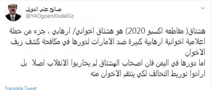 وكتب في تغريدة عبر "تويتر" رصدها "المشهد العربي": "هاشتاق (مقاطعه اكسبو 2020) هو هاشتاق إخواني/ إرهابي، جزء من حملة إعلامية إخوانية إرهابية كبيرة ضد الإمارات لدورها في مكافحة كشف زيف الإخوان".