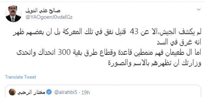 وقال في تغريدة عبر "تويتر" رصدها "المشهد العربي": "لم يكشف الجيش، إلا عن 43 قتيل نفق في تلك المعركة بل أن بعضهم ظهر أنه غرق في السد.. أما آل طعيمان فهم منمطين قاعدة وقطاع طرق بقية 300 أتحداك وأتحدى وزارتك أن تظهرهم بالاسم والصورة".