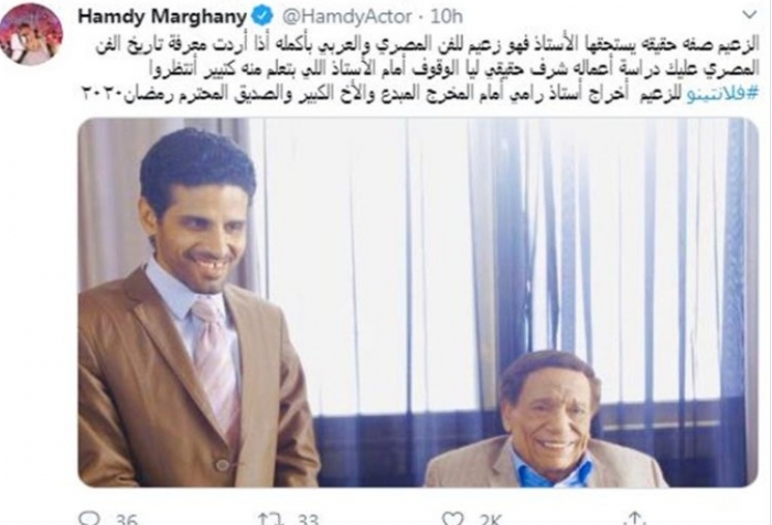 وأضاف: "شرف حقيقي ليا الوقوف أمام الأستاذ اللي بتعلم منه كتير.. انتظروا فلانتينو للزعيم، إخراج الأستاذ رامي إمام المخرج المبدع والأخ الكبير والصديق المحترم رمضان2020".