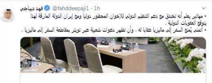 طالب المحلل السياسي السعودي فهد ديباجي، اليوم، بمنع السفر إلى ماليزيا وذلك بعد انعقاد ما تسمى القمة الإسلامية بكوالالمبور، مؤكدًا أنها ستكون أرض تجميع الإخوان والمرتزقة بعد تركيا.