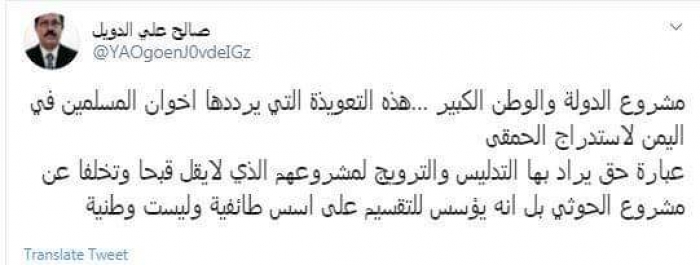 وكتب في تغريدة عبر "تويتر" رصدها "المشهد العربي": "مشروع الدولة والوطن الكبير ... هذه التعويذة التي يرددها إخوان المسلمين في اليمن لاستدراج الحمقى.. عبارة حق يراد بها التدليس والترويج لمشروعهم الذي لا يقل قبحًا وتخلفًا عن مشروع الحوثي بل إنه يؤسس للتقسيم على أسس طائفية وليست وطنية".