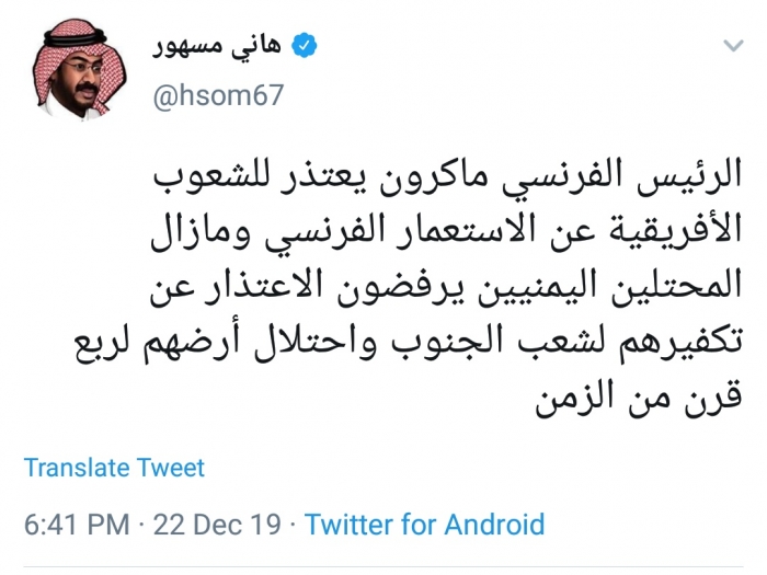 مسهور للمحتل اليمني: عليك النظر لاعتذار ماكرون لشعوب أفريقيا