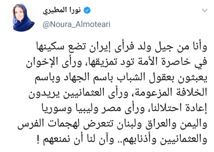 وكتبت المطيري، في تغريدة لها عبر موقع التواصل الاجتماعي تويتر، تابعها المشهد العربي: " أنا من جيل ولد فرأى إيران تضع سكينها في خاصرة الأمة تود تمزيقها، ورأى الإخوان يعبثون بعقول الشباب باسم الجهاد وباسم الخلافة المزعومة".
