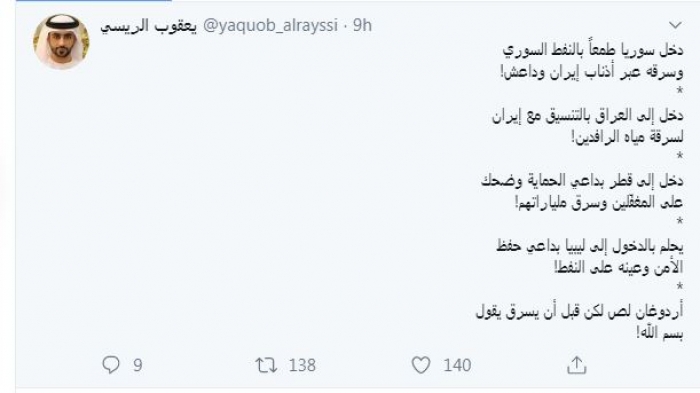 شن الكاتب الإماراتي يعقوب الريسي، اليوم، هجومًا حادًا على الرئيس التركي رجب طيب أردوغان، واصفًا إياه باللص.
