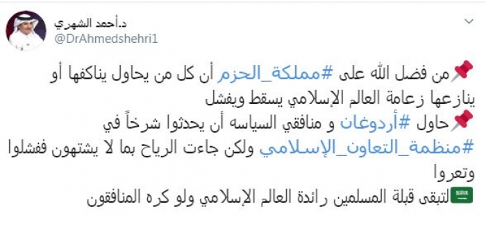 وكتب في تغريدة عبر "تويتر" رصدها "المشهد العربي": "من فضل الله على مملكة الحزم أن كل من يحاول يناكفها أو ينازعها زعامة العالم الإسلامي يسقط ويفشل.. حاول أردوغان ومنافقي السياسه أن يحدثوا شرخاً في منظمة التعاون الإسلامي ولكن جاءت الرياح بما لا يشتهون ففشلوا وتعروا لتبقى قبلة المسلمين رائدة العالم الإسلامي ولو كره المنافقون".