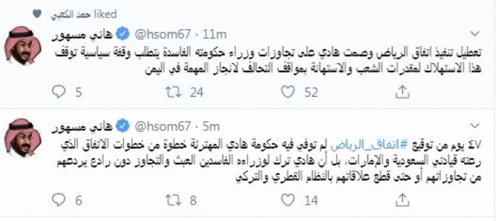 انتقد المحلل السياسي هاني مسهور، اليوم، صمت الرئيس اليمني المؤقت عبدربه منصور هادي، على تعطيل حكومة الشرعية لتنفيذ اتفاق الرياض.