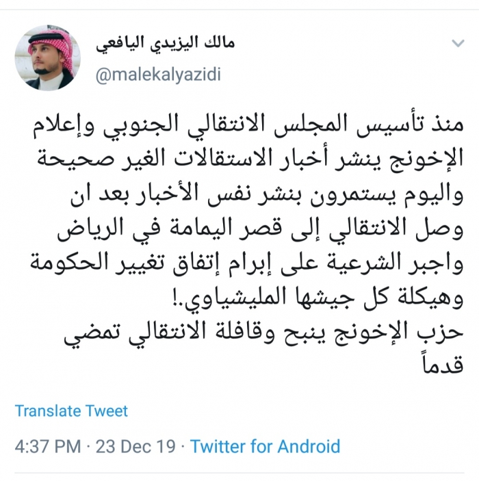 وكتب اليافعي، في تغريدة له عبر موقع التواصل الاجتماعي تويتر، تابعها المشهد العربي: "منذ تأسيس المجلس الانتقالي الجنوبي وإعلام الإخونج ينشر أخبار الاستقالات الغير صحيحة".