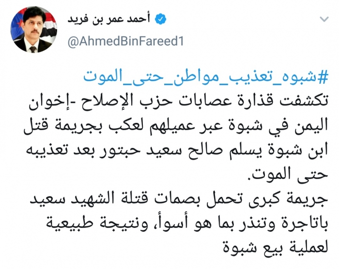 وكتب بن فريد، في تغريدة له عبر موقع التواصل الاجتماعي تويتر، تابعها المشهد العربي: "تكشفت قذارة عصابات حزب الإصلاح-إخوان اليمن في شبوة عبر عميلهم لعكب بجريمة قتل ابن شبوة يسلم صالح سعيد حبتور بعد تعذيبه حتى الموت".