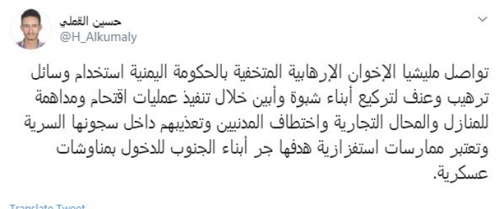 وقال في تغريدة عبر "تويتر" رصدها "المشهد العربي": "تواصل مليشيا الإخوان الإرهابية المتخفية بالحكومة اليمنية استخدام وسائل ترهيب وعنف لتركيع أبناء شبوة وأبين خلال تنفيذ عمليات اقتحام ومداهمة للمنازل والمحال التجارية واختطاف المدنيين وتعذيبهم داخل سجونها السرية".