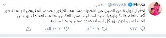 وكتبت إليسا تدوينة قالت فيها: "الأخبار الواردة من الصين عن اضطهاد مسلمي الإيجور بتصدم، المفروض إنو لما نتطور أكثر بالعلم والتكنولوجيا، تزيد انسانيتنا مش العكس".