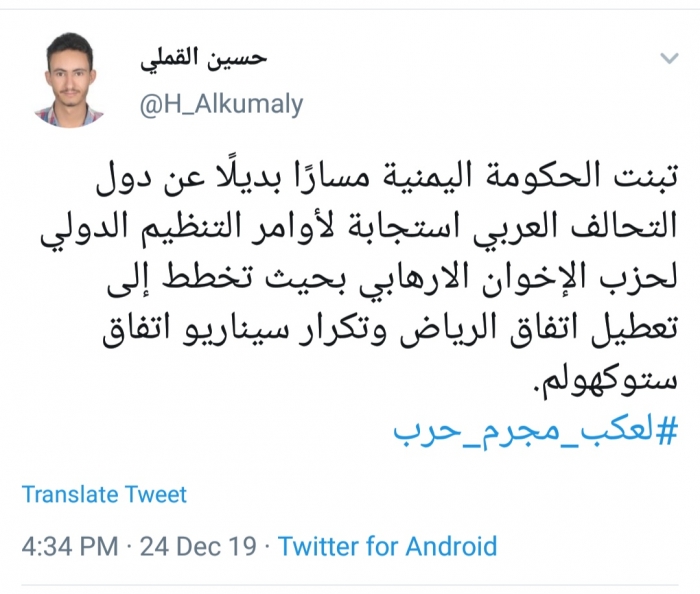 وكتب القملي، في تغريدة له عبر موقع التواصل الاجتماعي تويتر، تابعها المشهد العربي: "تبنت الحكومة اليمنية مسارًا بديلًا عن دول التحالف العربي استجابة لأوامر التنظيم الدولي لحزب الإخوان الارهابي".