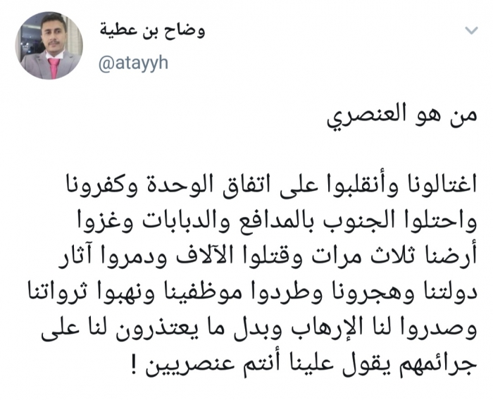 استنكر عضو هيئة رئاسة المجلس الانتقالي الجنوبي، وضاح بن عطية، وصف الإخوان للجنوبيين بالعنصرية.