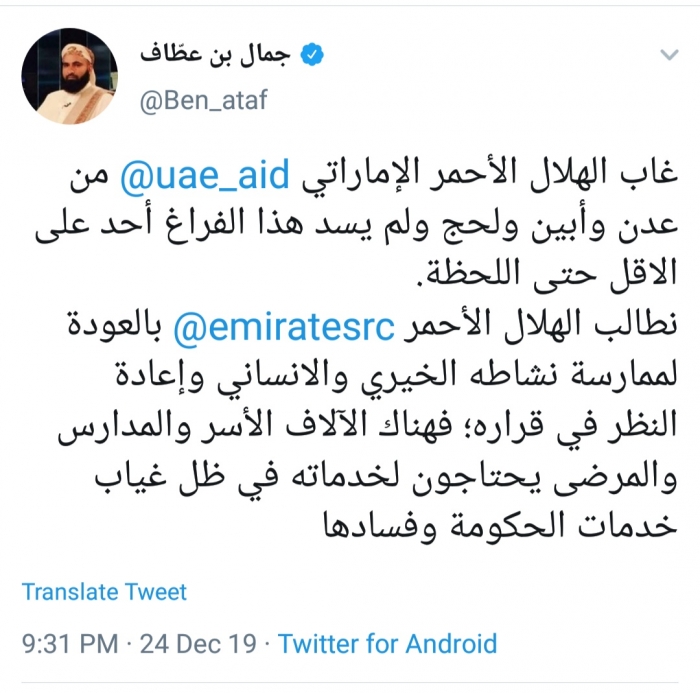 وكتب بن عطاف، في تغريدة له على موقع التواصل الاجتماعي تويتر، تابعها المشهد العربي: "غاب الهلال الأحمر الإماراتي من عدن وأبين ولحج ولم يسد هذا الفراغ أحد على الاقل حتى اللحظة".
