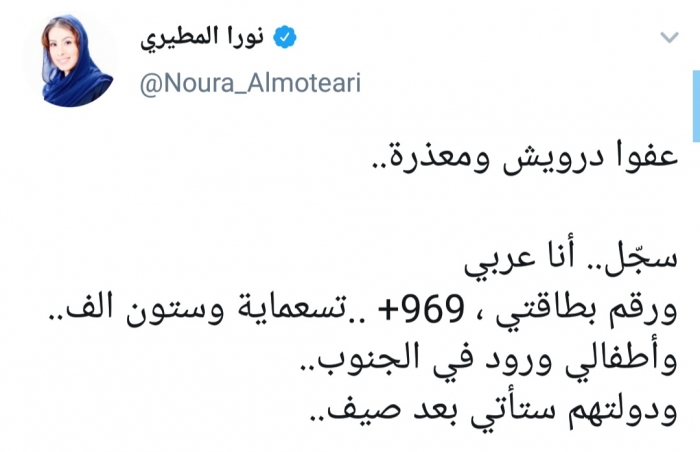 وكتبت المطيري، في تغريدة لها عبر موقع التواصل الاجتماعي تويتر، تابعها المشهد العربي: "عفوا درويش ومعذرة.. سجّل.. أنا عربي ورقم بطاقتي 969+ .. تسعماية وستون ألف".