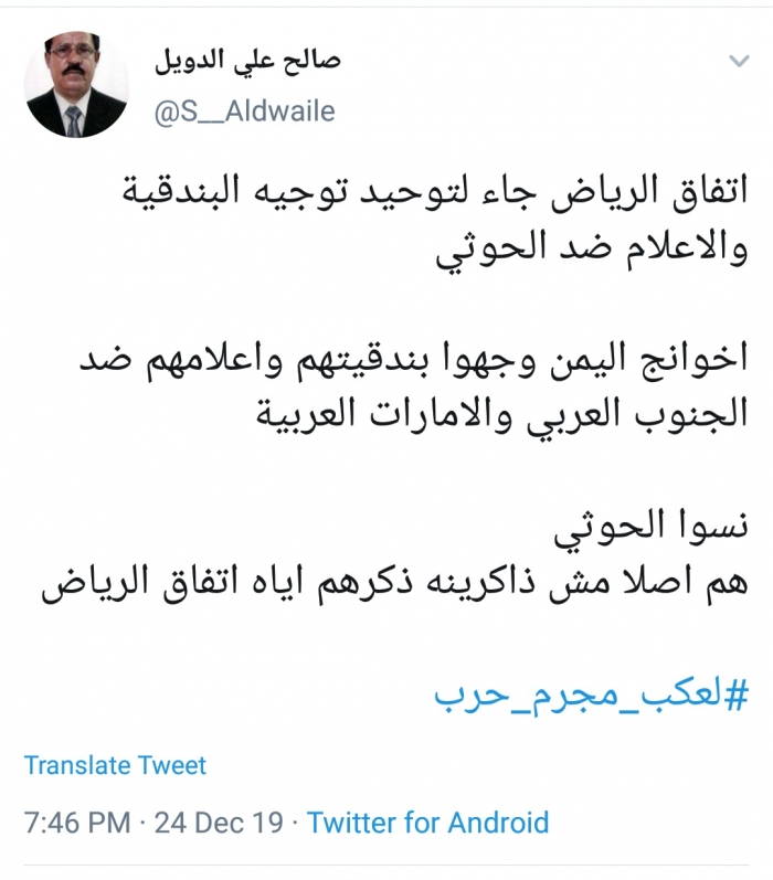 وكتب الدويل، في تغريدة له على موقع التواصل الاجتماعي تويتر، تابعها المشهد العربي: "إخوانج اليمن وجهوا بندقيتهم وإعلامهم ضد الجنوب العربي والإمارات العربية".
