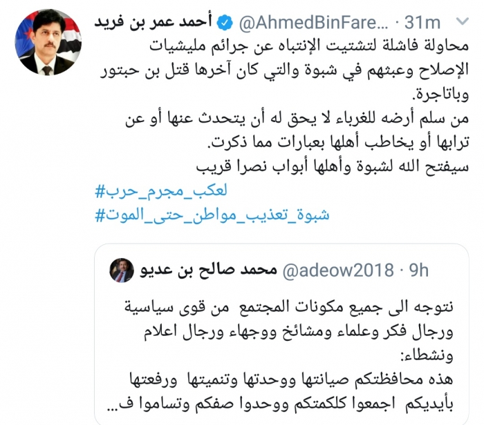 وكتب بن فريد، في تغريدة له على موقع التواصل الاجتماعي تويتر، تابعها المشهد العربي: "محاولة فاشلة لتشتيت الانتباه عن جرائم مليشيات الإصلاح وعبثهم في شبوة والتي كان آخرها قتل بن حبتور وباتاجرة".