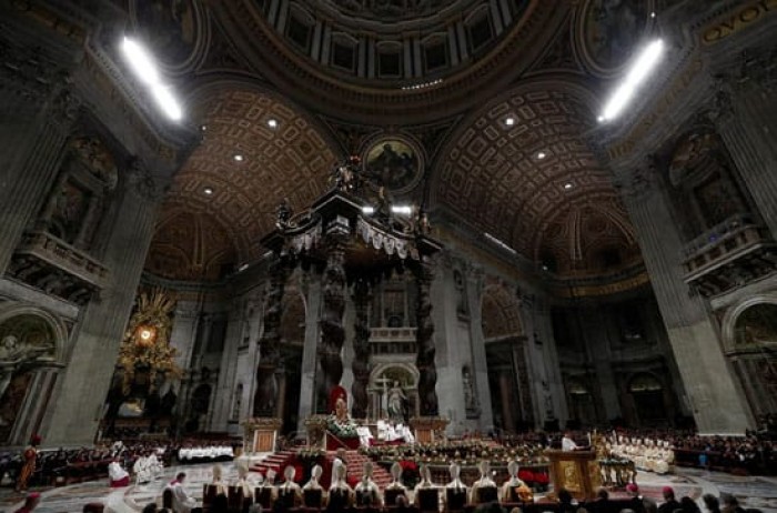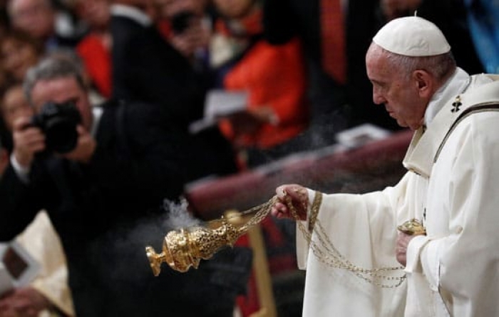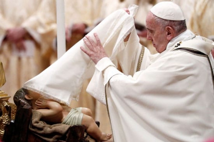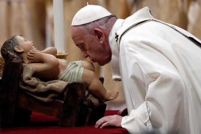 قبل فرنسيس الأول بابا الفاتيكان، تمثال للطفل "يسوع"، خلال مراسم الاحتفال بقداس عيد الميلاد " الكريسماس "، في كاتدرائية القديس بطرس في الفاتيكان.