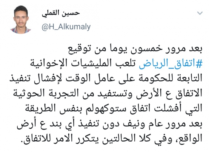 وكتب القملي، في تغريدة له عبر موقع التواصل الاجتماعي تويتر، تابعها المشهد العربي: "بعد مرور خمسين يوما من توقيع اتفاق الرياض تلعب المليشيات الإخوانية التابعة للحكومة على عامل الوقت لإفشال تنفيذ الاتفاق على الأرض".