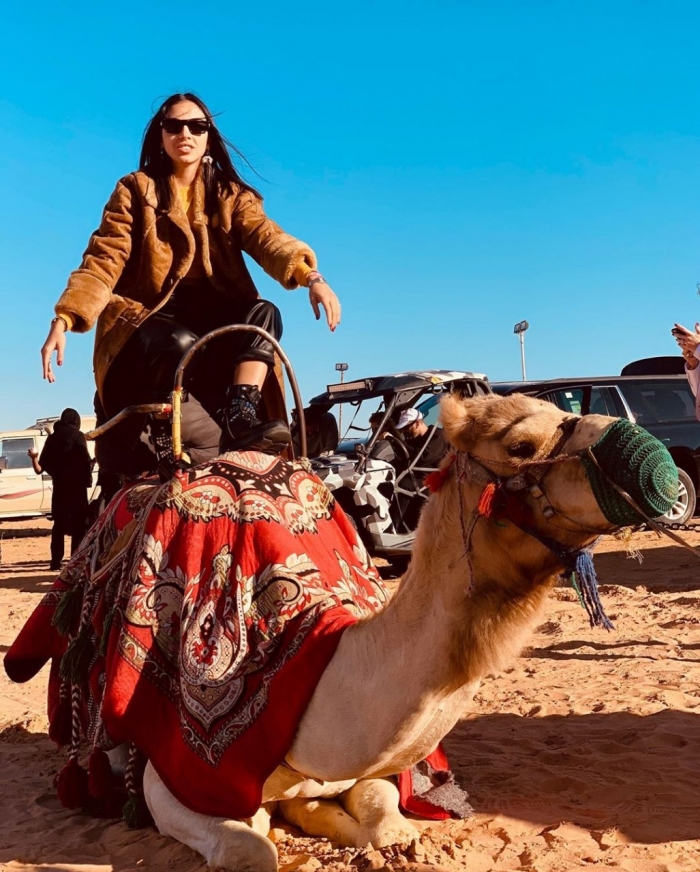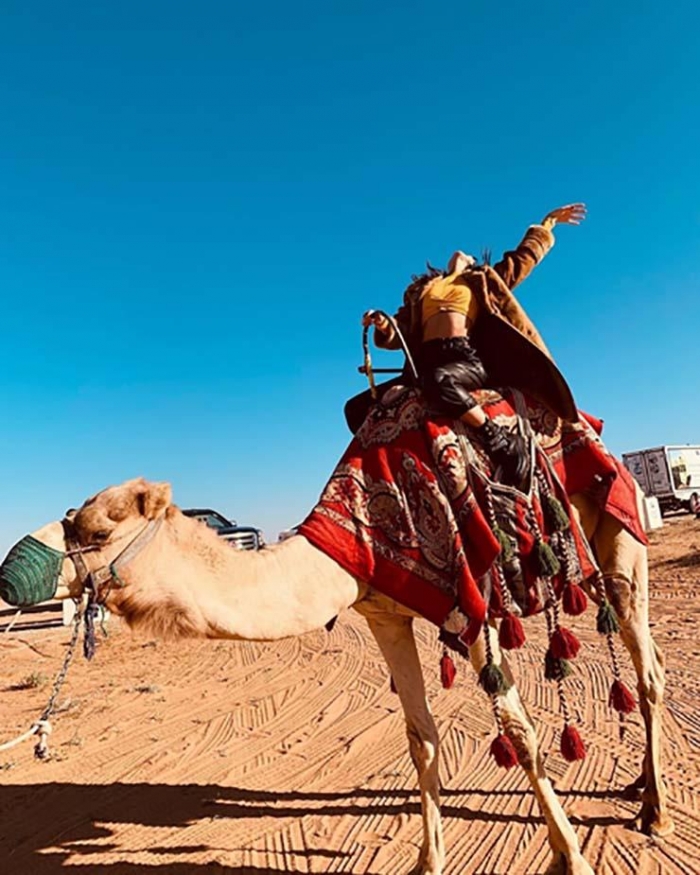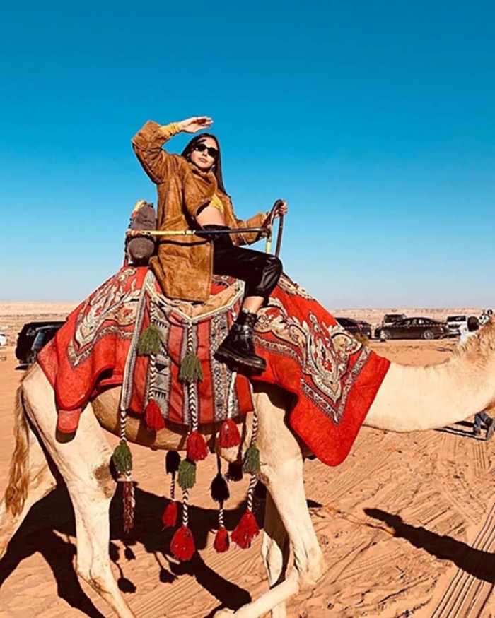 وظهرت سلمى في إحدى الصور على جمل وسط الصحراء، وعلقت :"من الصحراء الجميلة".