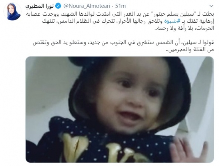 وقالت في تغريدة عبر "تويتر" رصدها "المشهد العربي": "بحثت لسيلين يسلم حبتور عن يد الغدر التي امتدت لوالدها الشهيد، ووجدت عصابة إرهابية تفتك بشبوة وتلاحق رجالها الأحرار، تتحرك في الظلام الدامس، تنتهك الحرمات، بلا رأفة ولا رحمة.. قولوا لـ سيلين، أن الشمس ستشرق في الجنوب من جديد، وستعلو يد الحق وتقتص من القتلة والمجرمين".